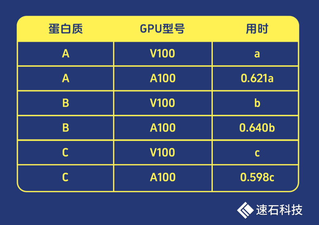 可以看到,對同一個蛋白質進行結構預測,A100用時約為V100的60-64%。