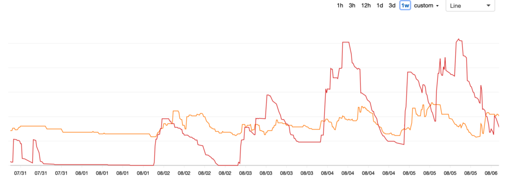 其中橙色曲線為OD實(shí)例的使用狀況,紅色曲線為SPOT的使用狀況。
