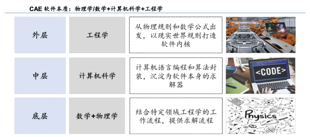 CAE軟件從本質(zhì)上來看,可以拆解為三層:數(shù)學(xué)+物理學(xué)(底層)、計算機科學(xué)(中層)、 工程學(xué)(外層)。