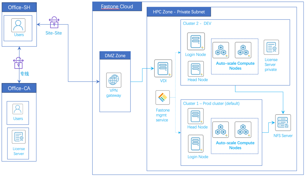 在用戶最關(guān)心的網(wǎng)絡(luò)層面,我們部署了未來可拓展的混合網(wǎng)絡(luò)架構(gòu),利用專線網(wǎng)絡(luò)和Site-to-Site VPN技術(shù)將加利福尼亞、上海等多個辦事處打通。在保障了網(wǎng)絡(luò)連接性能,優(yōu)化ScaleFlux工程師訪問體驗的同時,通過TLS通信加密的方式在傳輸過程中保護數(shù)據(jù)安全。